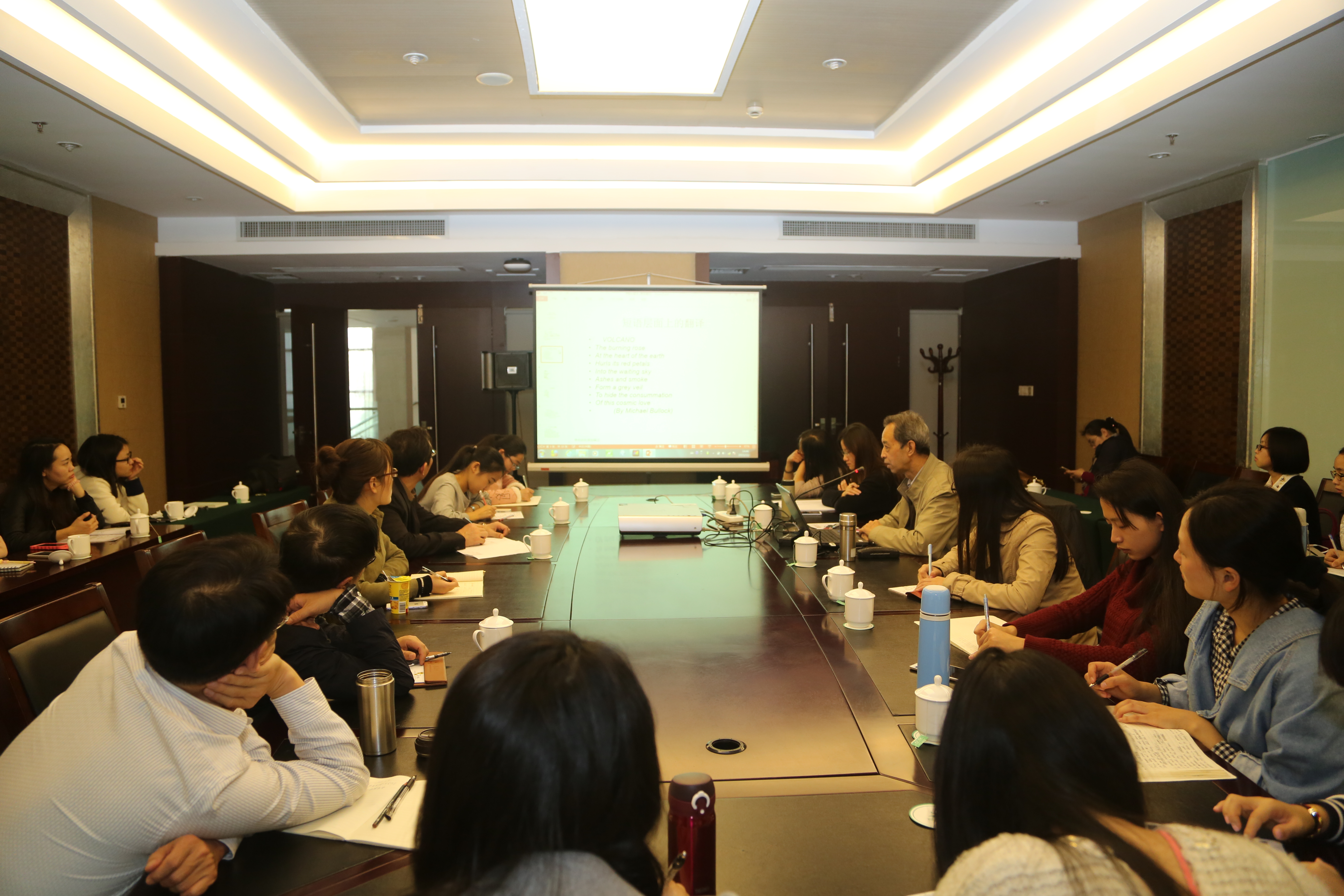 讲座中,王教授从“诗不可译乎?”出发,以四首具体诗歌(Volcano、《江雪》、A Kiss、《登乐游原》)为例,结合自己诗歌创作和翻译的切身体会,深入浅出,旁征博引,在不经意间生动形象地阐释了诗歌的定义、修辞、韵律、特征等,并总结了古典诗歌翻译的理念与原则,向在场的师生展示了欣赏和翻译古典诗歌的无穷魅力。