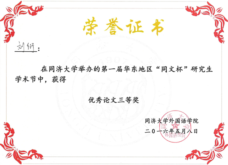 2016年5月8日,第一届华东地区“同文杯”研究生学术节在同济大学乐鱼leyu(中国)同文楼隆重举行。来自全国26所高校的上百名研究生济济一堂、共飨学术盛宴,围绕“国际视野与中国语境观照下的外国语言文学研究”这一主题,在语言学、文学和翻译等研究领域进行了充分交流。本次学术节共收到来自北京大学、中国人民大学、复旦大学、同济大学、中南大学、华东师范大学、上海外国语大学以及江南大学等26所高校的博士和硕士研究生投稿论文105 篇。我院方文开教授指导的2014级硕士研究生刘衍携论文参加了此次学术节。