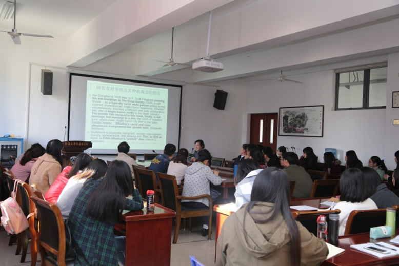 2016年11月11日下午,北京外国语大学博士生导师潘志明教授在文科楼A349会议室为我院师生作了题为“伊迪丝·华顿的盖茨比信件”的学术讲座,讲座由方文开教授主持。