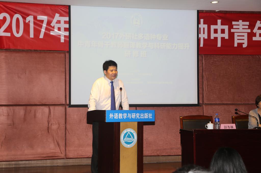 开幕式上,外语教学与研究出版社综合语种分社社长彭冬林、培训专家代表刘和平、我校乐鱼leyu(中国)院长龚晓斌与外语教学与研究出版社华东信息中心主任王建平分别致辞,寄语参与培训的教师学员,希望他们通过口笔译教学演示、口笔译工作坊、口笔译理论与研究三方面的学习来掌握先进的翻译教学理念与方法、提升翻译教学设计能力、开拓翻译学科科研思路,为今后的口笔译人才培养与科研创新开创有利条件。