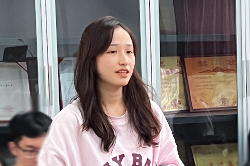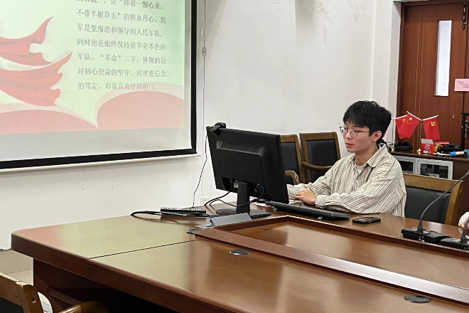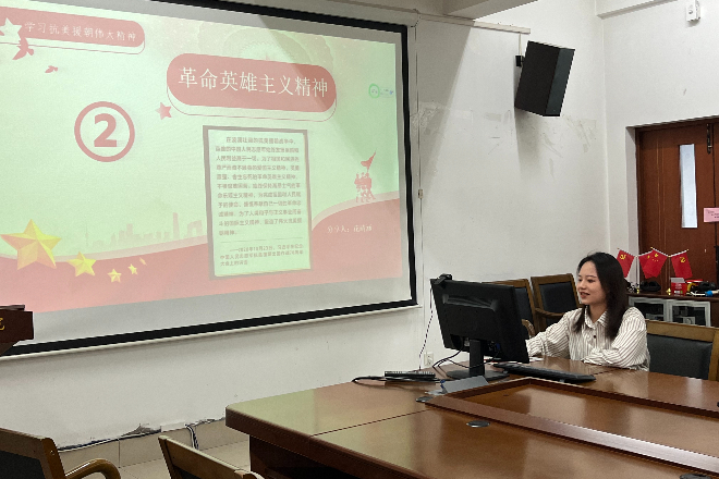 座谈会正式开始,三位党支部成员轮流为学生们介绍抗美援朝伟大精神。罗品辉同学首先简要介绍了抗美援朝精神的内涵,即爱国主义精神、革命英雄主义精神、革命乐观主义精神、革命忠诚精神和国际主义精神。随后,她就爱国主义精神展开详细阐述,围绕“什么是爱国主义精神”和“如何弘扬爱国主义精神”两大基本问题带领同学们学习爱国主义精神并结合前国家总理李克强的讲话视频及当下流行短剧《逃出大英博物馆》引导同学们感悟爱国主义精神。最后她号召大家弘扬爱国主义精神,构筑中华民族共有精神家园。花靖涵同学带领同学们领悟了英勇顽强、舍生忘死的革命英雄主义精神和不畏艰难困苦、始终保持高昂士气的革命乐观主义精神,并结合国家当前形势,探讨了如何将这两个伟大精神应用到社会实践中去。张海熠同学则通过分享历史小故事的方式介绍了革命忠诚精神和国际主义精神。他总结道,革命忠诚精神是抗美援朝精神的底蕴,是支撑起志愿军将士革命英雄主义精神和革命乐观主义精神的深层次因素;国际主义精神是抗美援朝精神的有机组成,是激励中国人民志愿军奔赴朝鲜战场的重要动因。