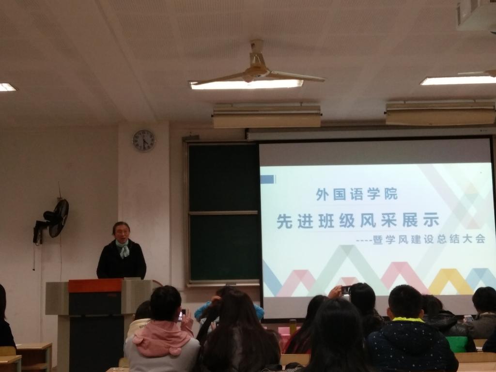 最后由赵莹老师宣读本次班级风采展示的评选结果。19个参选班级中的8个班级获得了先进班级荣誉,它们分别为日语1403,英语1403,英语1506,英语1502,英语1601,英语1603,英语1606以及日语1601。
