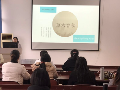 首先,由十名选手带着自己的ppt进行自我展示。选手们结合活动主题,制作了精美的ppt对他们各自作品的创作灵感以及特色进行了介绍。有些选手以思乡之情作为自己的写作主题,而有些选手则是围绕小女生对于爱情的雀跃之情做了刻画。每种阐释都令人眼前一亮,展现了我院学生出色的语言能力和创新精神。每个选手展示完成后,都会有评委老师进行点评。