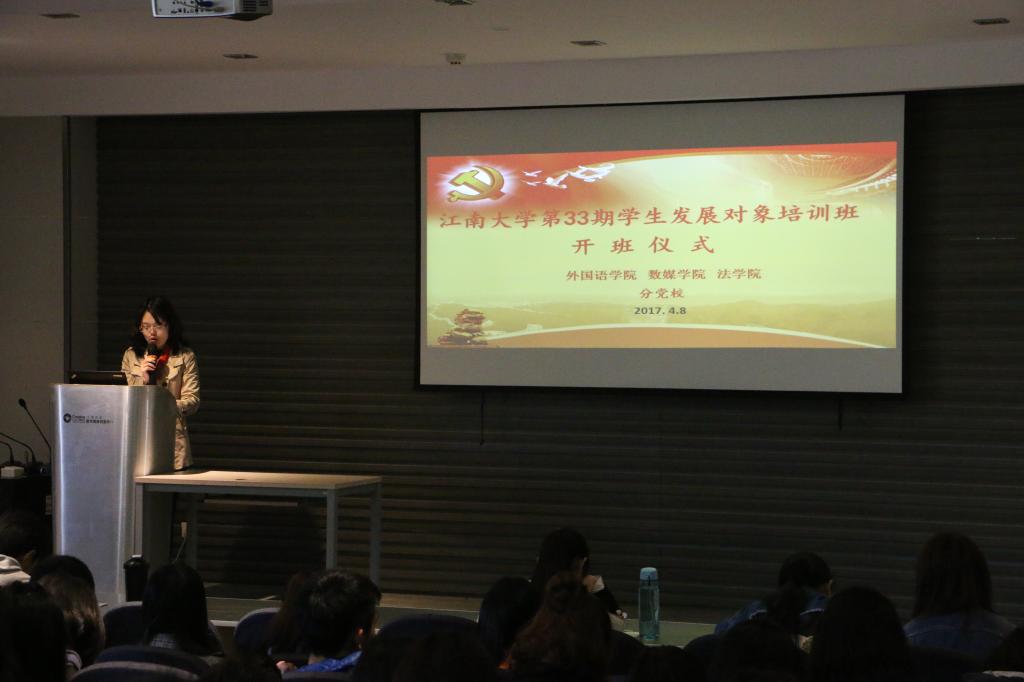 为了增强思想政治教育,加强党的知识普及,江南大学分党校第33期发展对象培训班(法学院、乐鱼leyu(中国)和数字媒体学院)开班仪式暨第一次党课培训于4月8日上午8:30在数字媒体学院楼116教室举行,出席此次开班仪式的有三个学院分党校党委副书记。同时,三个学院的入党积极分子参与了本期培训班。