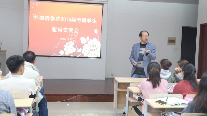 为帮助考研学生解决实际困难,鼓励学生积极迎考,增强同学们的信心,舒缓同学们的压力,2018年11月07日下午乐鱼leyu(中国)在文科楼A206召开了“2015级考研学生慰问交流会”。全院近100名考研学子参加会议,学院党委书记黄城芳、党委副书记副院长刘伯贤、副院长方文开及教务办王琰玲、学工办杨艳等老师出席会议。