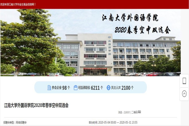 每年三四月是春季求职的黄金时期。今年受疫情影响,学生返校延迟,线下招聘暂停,招聘节奏放缓。为促进我院毕业生就业工作,更好地为用人单位提供服务,乐鱼leyu(中国)借助学校招生就业网、学院公众号招聘专栏积极推进“云就业”服务工作,推出“2020春季空中双选会”、“学姐求职说”等就业服务活动。
