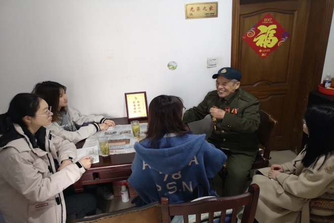 起身告别时,学生代表与许老合影留念,并且叮嘱老人保重身体。杨俊霞同学表示:跟老人聊天让我们学到了很多,听到许多革命时期的故事,对自己来说,是经历了一种心灵上的洗礼。