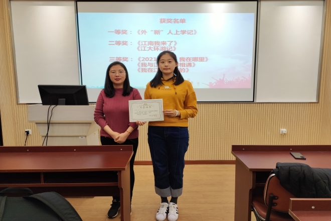 首先,陆芳老师对“我在江苏上大学”抖音短视频拍摄大赛院级选拔赛做出总结,并为获奖的6个作品颁奖。一等奖为英语2103《外“新”人上学记》,二等奖为英语2104《江南我来了》、英语2102《江大环游记》,三等奖为英语2101《2021年秋天 我在哪里》、日语2102《我与江南初相遇》和日语2102《我在江大挺好的》。