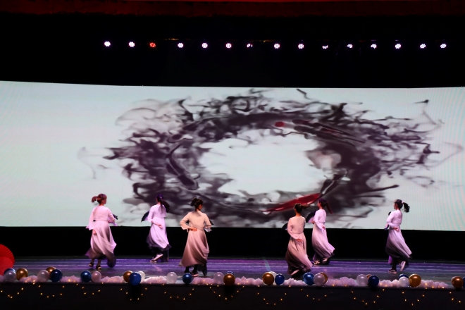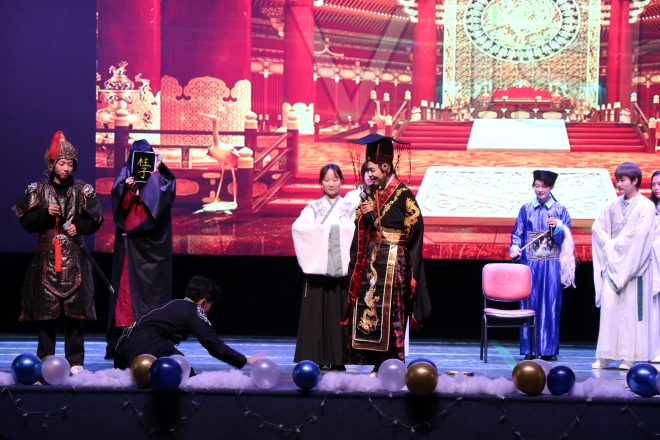 晚会由拳击猫乐队表演的《On my own》开场,气氛热烈,燃爆全场。第一篇章在民舞《书简》的翩若惊鸿中正式开始。日语歌《Lemon in the summertime》勾起了我们对夏日时光的回忆;话剧《荆轲刺秦王》由外院艺术团表演,他们将英语融入历史背景,幽默诙谐的风格让观众笑声连连;日语配音《哆啦A梦》在带我们重温经典的同时,感受到了日语配音的魅力。