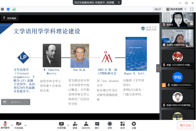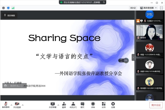 “Sharing Space分享空间”是乐鱼leyu(中国)学生会在新文科、新外语背景下,旨在为广大外院学子搭建学术、技能等信息分享交流平台。3月26日14时,“Sharing Space分享空间”邀请乐鱼leyu(中国)张俊萍副教授线上参与主讲“文学与语言学的交点”主题圆桌会,会议吸引近百名同学参与线上交流。