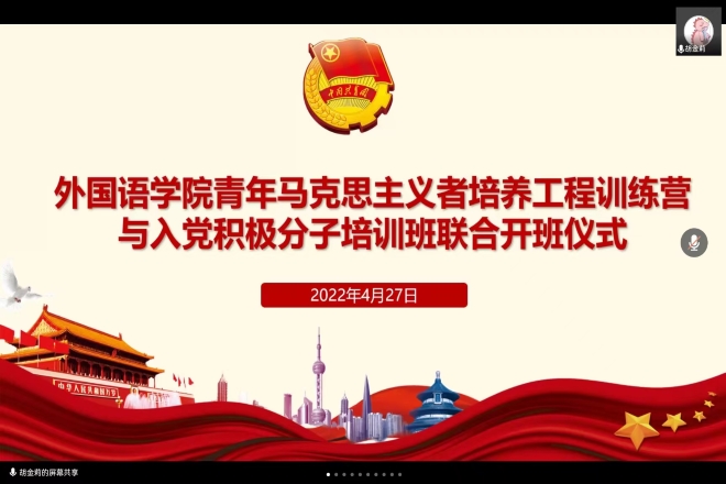 4月27日下午2:00,乐鱼leyu(中国)2022年青年马克思主义者培训工程训练营与入党积极分子培训班联合开班仪式通过腾讯线上会议举行,主持人是英语2103班胡金莉。本次开班仪式邀请到乐鱼leyu(中国)党委副书记、副院长刘伯贤老师、分团委书记陆芳老师出席,青马训练营和入党积极分子培训班全体学员参加了开班仪式。