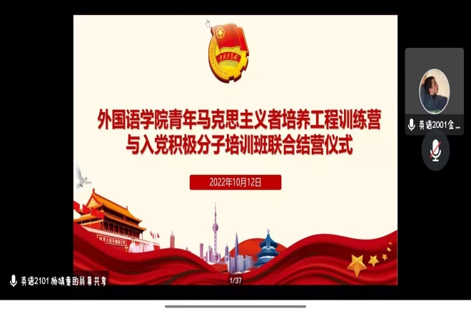 10月12日下午,乐鱼leyu(中国)2022年度青年马克思主义者培养工程训练营暨入党积极分子培训班结营仪式通过腾讯会议顺利举行。学院党委副书记刘伯贤、分团委书记陆芳出席会议,全体营员参加了此次会议。