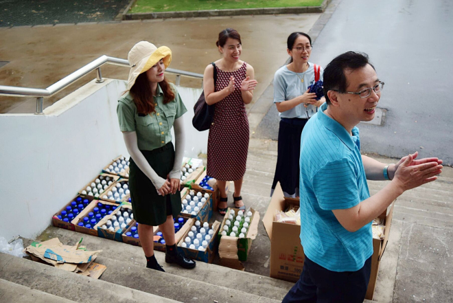 全体参训同学在教官的激情指挥下合唱了《团结就是力量》、《爱警习武歌》等军歌,嘹亮的歌声展现了同学们昂扬的斗志和朝气蓬勃的精神面貌。接下来,黄书记代表学院对全体承训教官表示衷心的感谢,向全体参训学生表达关怀和殷切希望。对外院学子坚毅与拼搏的精神给予了高度肯定,并鼓励同学们培养吃苦耐劳、坚持到底的优秀品格。随后,学院领导和老师为同学们分发了面包、饮料等慰问品。“千里送鹅毛,礼轻情意重。”虽然只是简单的食品,但让大家感受到了学院对每一位同学深深的关心和爱护。同学们再次唱响军歌表达了对冒雨慰问的学院领导老师们的感谢。最后,慰问活动在学院领导、老师与教官、同学们的合影留念中圆满结束。