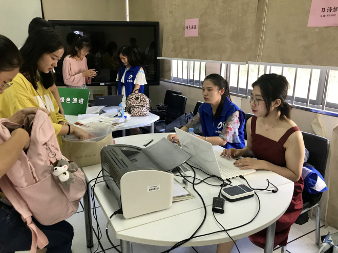 2018年8月29日上午七点半,乐鱼leyu(中国)新生报到工作也迎着朝阳顺利开展。正如乐鱼leyu(中国)楼外悬挂的横幅所写:“英姿勃发,日渐成才;欲立鸿鹄志,外院助你成”,乐鱼leyu(中国)的迎新工作也是如此。报到处分三组迎接来自的新生:确认录入新生报到信息、分发新生材料、回答新生与家长们对新学校学习生活的疑惑等。同时设置了绿色通道,为无法按时交清学费的同学办理相关手续,帮助其顺利入学。尽管天气炎热,但院学生会和青协志愿者们热情不减,耐心、细致、周到地为新生及家长提供服务,各个环节都有条不紊地进行着。