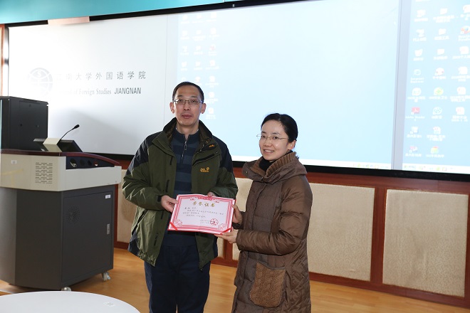 龚晓斌院长向学院“教学名师”宣泠老师颁发证书