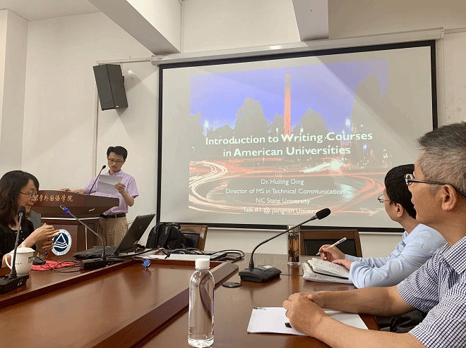 讲座中,丁慧玲教授首先介绍了美国北卡罗莱纳州立大学的写作课程设置及历史渊源,详细讲解了大学英语写作和英语专业写作课程的具体内容。随后,丁慧玲教授结合实际例子介绍了对写作剽窃现象的观察与研究发现,强调了写作中的规范性和伦理。紧接着,丁教授转向简历的写作,指出了简历书写中contrast、repetition、alignment和proximity的基本原则,同时通过个人例子讲解了如何在全球最大职业社交网络Linkedin(领英)平台上进行专业的自我介绍、建立和维护人际关系。之后,丁教授重点讲解了自己专业方向technical communication及rhetoric analysis的定义及内涵, 辨析了在沟通中扮演重要角色的ethos、pathos和logos三要素,通过个人陈述的书写及项目管理的介绍展示了相关要素的作用方式和可操作方法。最后丁教授介绍了对学术写作,特别是美国项目基金申请书写作的对比研究发现,这为外语学院老师的国际学术交流活动提供了十分有价值的参考框架,讲座在一片掌声中结束。会后,多位老师积极提问,与丁慧玲教授进行了面对面的交流。此外学院还就江南大学与北卡罗莱纳州立大学展开3+2本科硕士直通车交流项目进行了深入交流,对即将展开的校际合作充满信心。