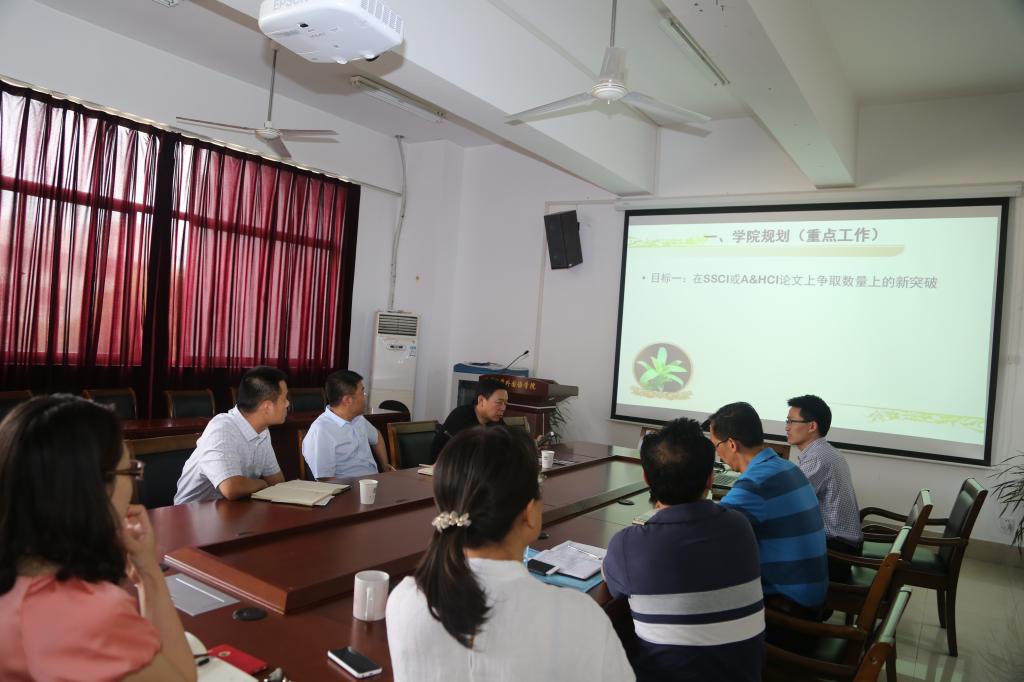 首先学院分管科研工作的副院长朱义华老师从学院规划、科研管理、智库建议与困难和诉求四个方面进行了汇报,随后龚院长对学院科研工作的发展思路、基地建设、人才短缺与“分压”发展等方面进行了补充说明。陈副校长、刘处长根据乐鱼leyu(中国)师资队伍现状、青年博士引进与课题奖项申报等方面的难点进行了一一分析与解答,并提出了具体的建议与应对策略。
