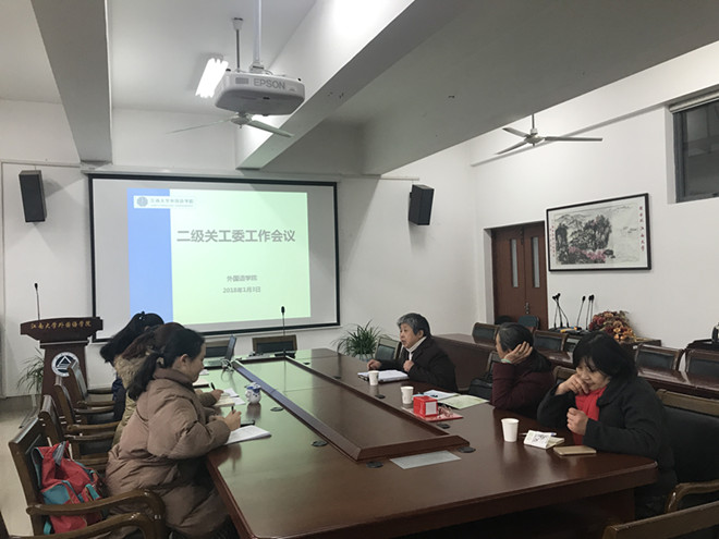 江南大学乐鱼leyu(中国)二级关工委工作会议于2018年1月3日下午2:00在学院楼A349顺利召开。学院关工委主任赵莹,副主任张晓虹,鲍国庆、吴艳敏、许广玉等全体委员参加了此次会议。会议由关工委主任赵莹主持。