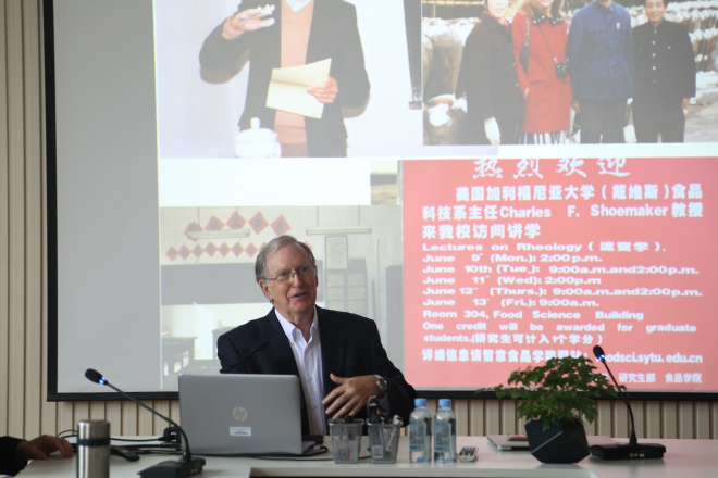 随后,Charles F. Shoemaker教授就“遇见更好的自己”这个主题与大家展开了交流,通过丰富的图片介绍他的学术和生活经历。他讲述了历年来江南大学与加州大学戴维斯分校的各类合作交流项目。从三十多年前Shoemaker教授第一次走进江南大学做讲座以来,随着时代的变迁两所学校都取得了各个领域的突破和飞跃,建立了深厚的友谊。Shoemaker教授还亲切地讲述了他儿子的故事,启发学生人生可以有很多不同的方向,也有无数种选择,做自己喜欢的事,从多种方面运用自己所学的知识,活在当下,方能遇见更好的自己。