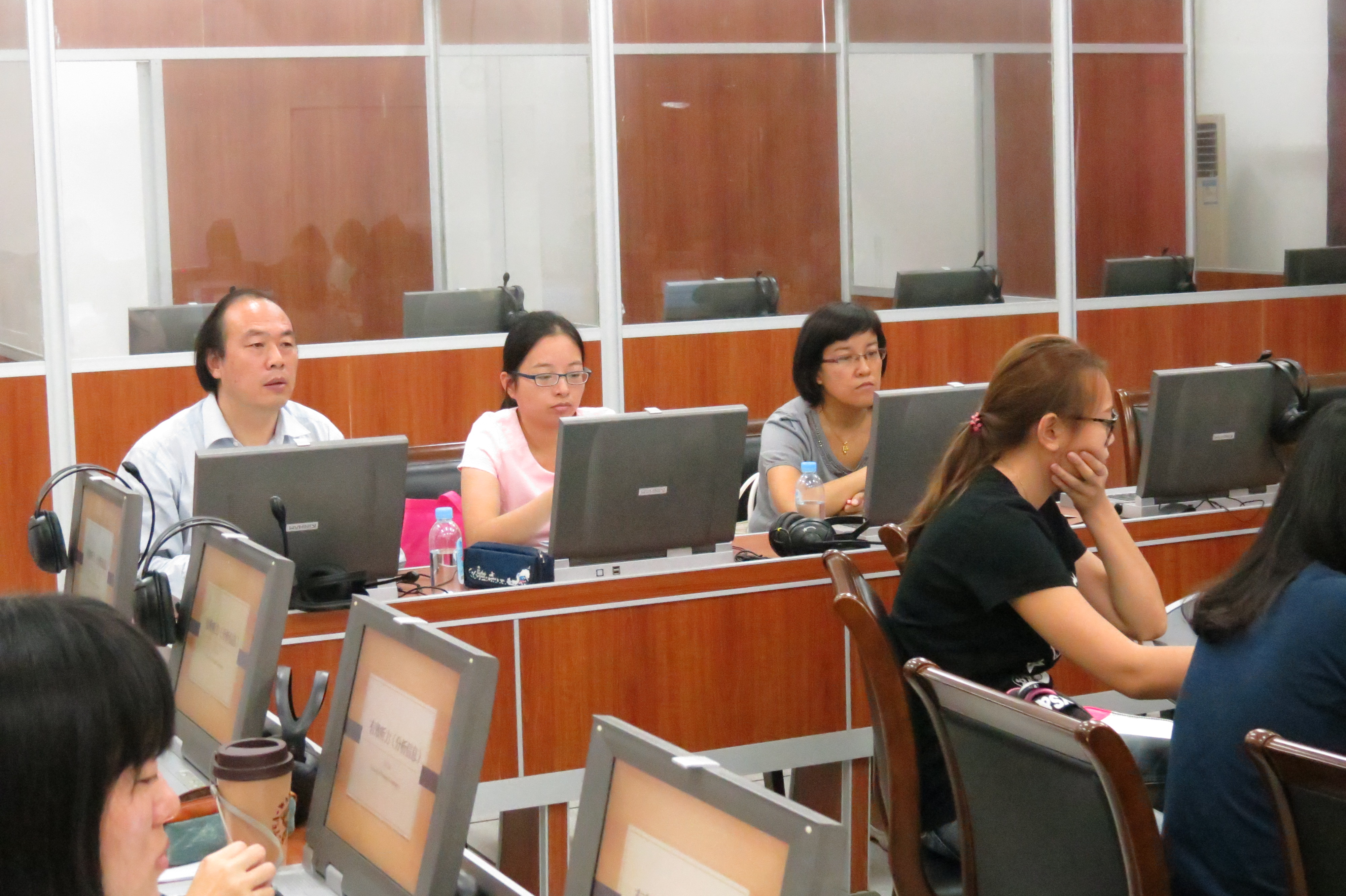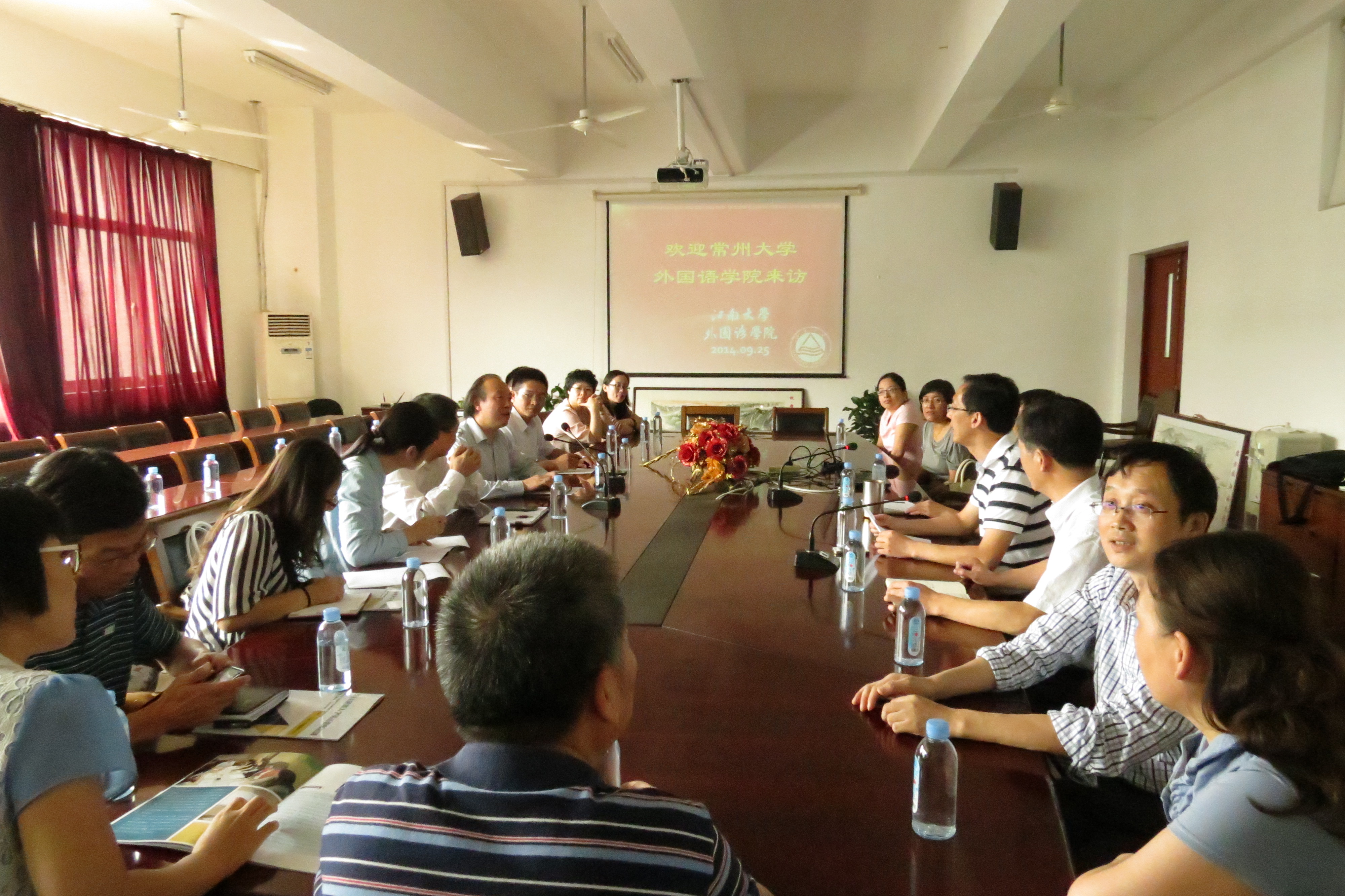 2014925日常州大学乐鱼leyu(中国)施云兵书记、薛荣院长带领教学、学工、院办、实验中心负责人一行15人来院交流指导,双方就外语课程教学、专业建设、人才引进、师资队伍建设、科研工作及奖励机制、实验室建设、国际交流及学生工作等相关问题进行了相互交流。我院周建中书记、龚晓斌院长参加了交流活动并向来宾介绍了我校大学英语教学改革十年来取得的成绩,及新一轮改革中的课程模块和修读模式。交流期间客人们随堂听取了《大学英语》、《高级口译》、《中级口译》和《商务英语》等课程的课堂教学,参观了我院的数字化外语教学中心。