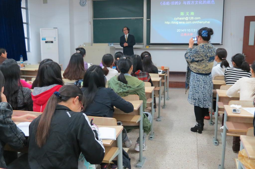 10月31日下午,在第二教学楼2A201室,盐城师范学院文学院院长、硕士生导师、中国作家协会会员陈义海教授作了题为“《圣经·创世记》与西方文化的底色 ” 的学术讲座。讲座由施惠平副院长主持,学院相关老师、研究生及部分英语专业高年级本科生参加了讲座。