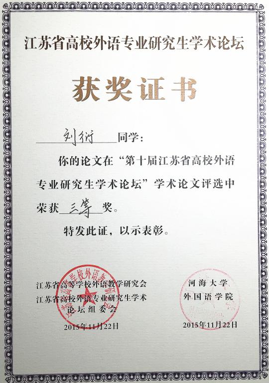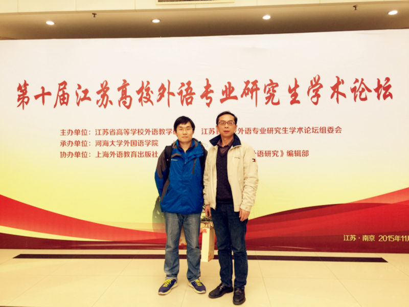2015年11月20至22日,由江苏省高等学校外语教学研究会和江苏省高校外语专业研究生学术论坛组委会主办、河海大学乐鱼leyu(中国)承办的第十届江苏高校外语专业研究生学术论坛在河海大学举行。来自省内20余所高校的200余名专家学者、博士、硕士研究生汇聚一堂,我院方文开教授带领2014级研究生刘衍参加了此次论坛。