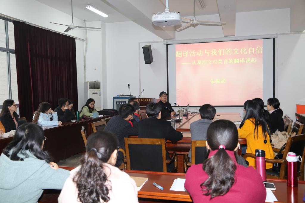 12月10日下午,上海大学博士生导师朱振武教授应邀在乐鱼leyu(中国)大会议室做了题为“翻译活动与我们的文化自信—从葛浩文对莫言的翻译谈起”的学术讲座。方文开副院长主持了讲座,我院数十名中青年教师和14级硕士研究生聆听了讲座。