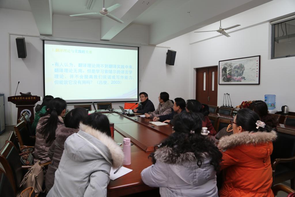 乐鱼leyu(中国)“卓越课堂”翻译模块互动式系列讲座第二场在拓展部翻译组教师们的期盼中于2016年1月12日下午在乐鱼leyu(中国)A349准时开讲了。主讲人为资深翻译教授孙志祥老师,讲座题目是《翻译理论在翻译教学中的应用》。