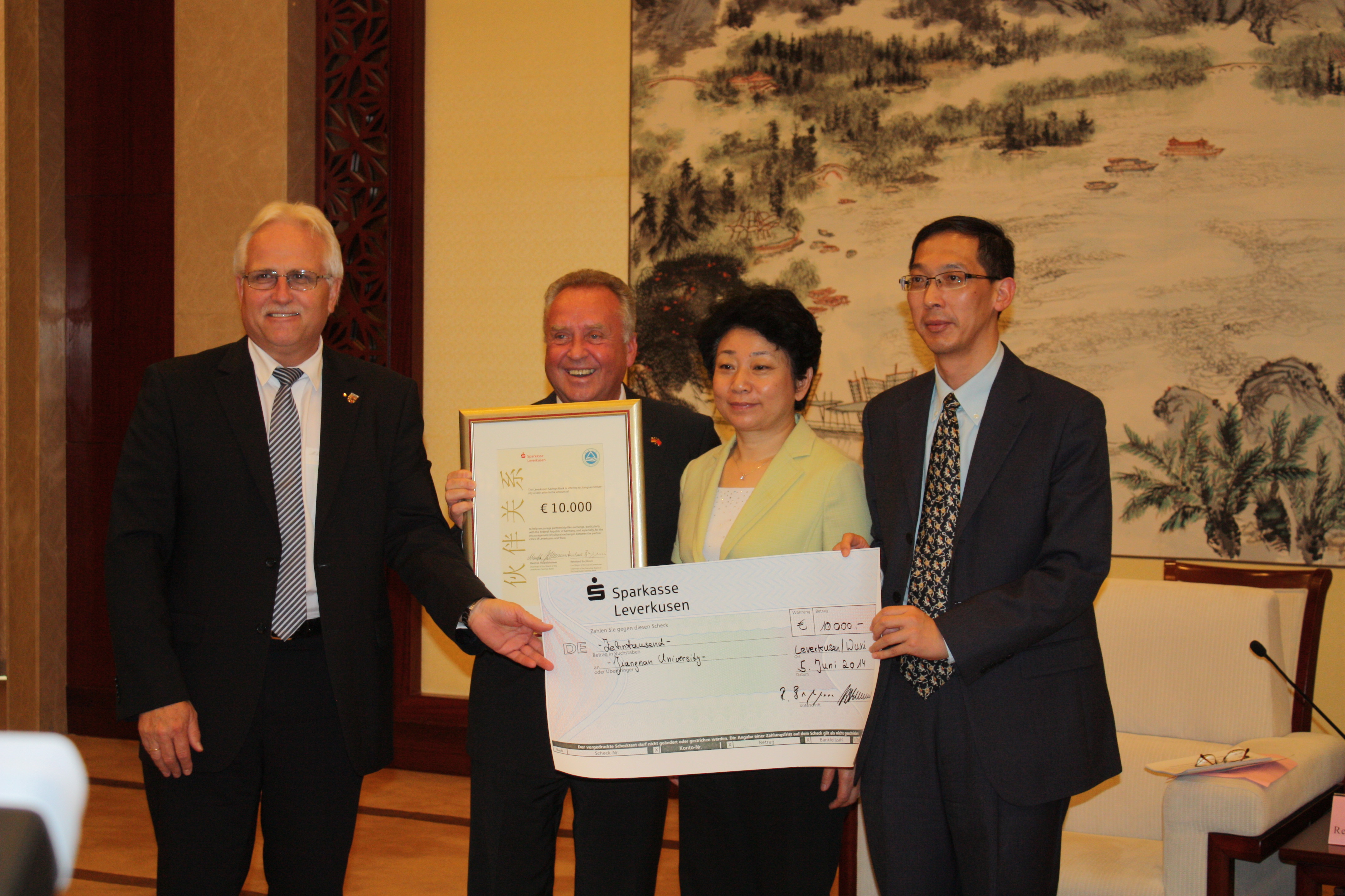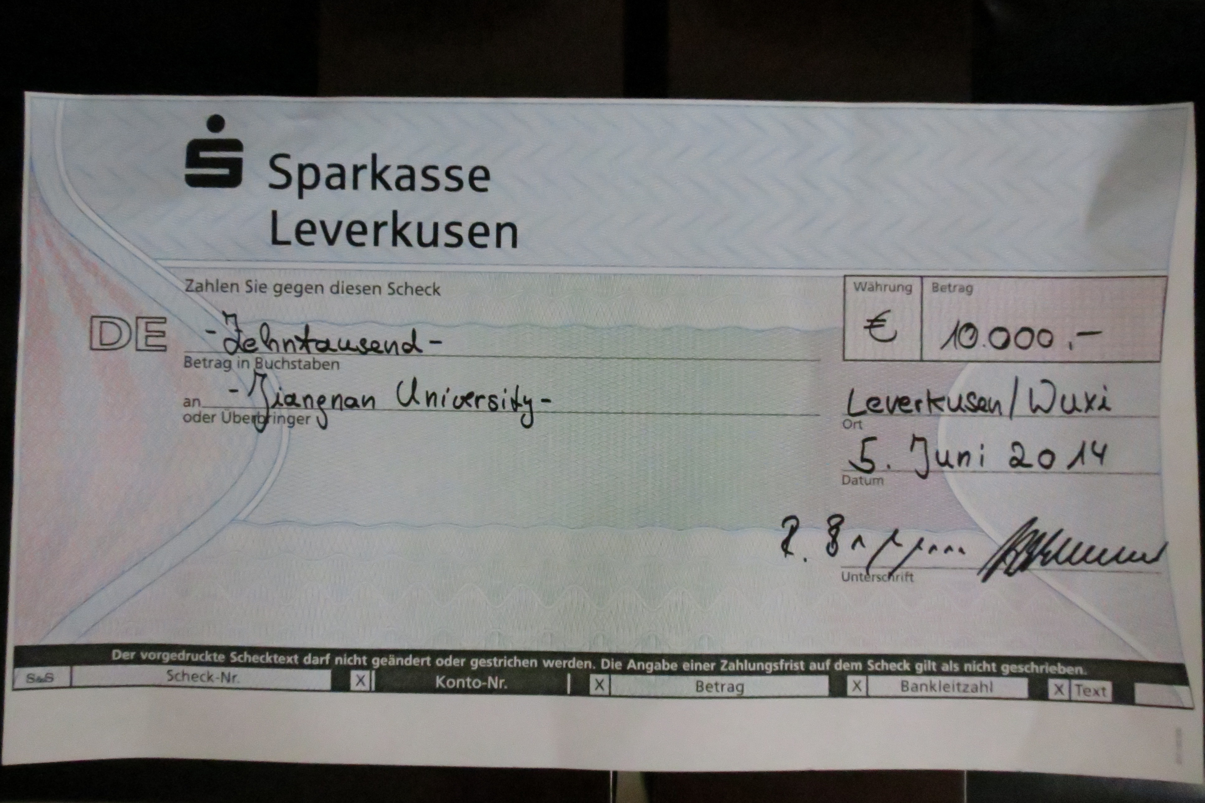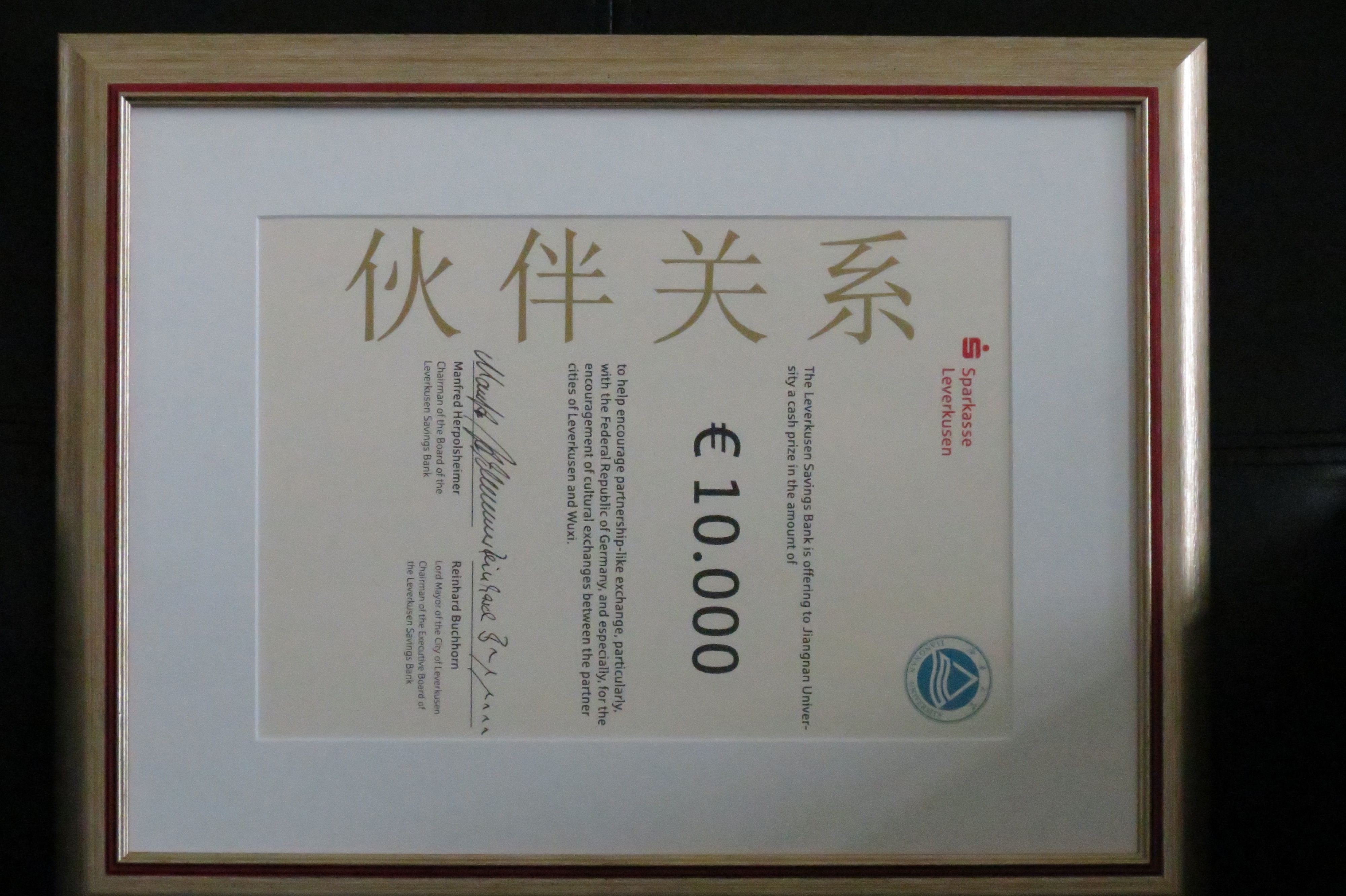 2014年6月5日,由市长莱茵哈德·博鸿(Reinhard Buchhorn)率领的德国勒沃库森市政府和企业家代表团一行到访无锡,与无锡市续签友城协议。省委常委、市委书记黄莉新、市领导张叶飞、嵇克俭在无锡市市民中心一号楼会见了德国客人。勒沃库森市代表团此次来锡访问,意在推进两市教育界的交流合作,促进两地企业之间的经贸往来。在友城协议续签仪式上,勒沃库森市代表团主要成员之一勒沃库森储蓄银行董事会主席首席执行官曼弗雷德·赫博斯海姆(Manfred Herpolsheimer)先生以个人名义向江南大学外语学院捐赠教育交流经费1万欧元,用于乐鱼官方端网站登录入口师生开展奖教助学与国际文化交流,特别是与德国之间的交流与合作。乐鱼官方端网站登录入口龚晓斌院长代表受捐方从曼弗雷德·赫博斯海姆手中接过了捐赠支票和“伙伴关系”证书。此次捐赠活动得到了朗盛(无锡)化工有限公司和我院德语教师邢爱华的大力支持,特此致谢。
