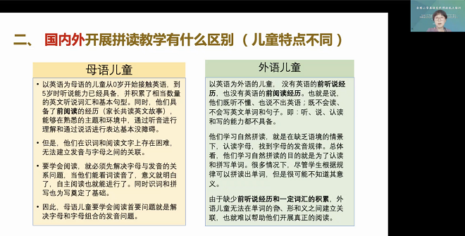 美国杰克逊州立大学教育学博士、集美大学乐鱼leyu(中国)教授、外语教师教育与发展研究所所长张海燕教授的话题为《小学英语教学中语音意识的培养》。她首先介绍了语音意识的定义及其构成要素,强调了它在自然拼读和语言学习中的重要性。通过具体实例的拼读教学演示辨析了一系列语音学术语。同时,她分享了美国课堂中提高学生语音意识的方法,为我国教师开展自然拼读教学提供了启示。
