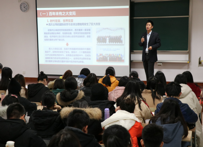 2019年12月18日下午2:00,我校党委戴月波副书记在二教2D308以“我国高等教育的改革与发展”为主题,为乐鱼leyu(中国)17级全体及19级英语专业共计286名同学讲授形势与政策课程。乐鱼leyu(中国)党委副书记、副院长刘伯贤,学院辅导员参加形势与政策课。