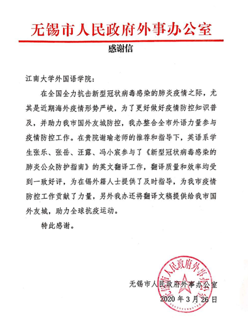 四位同学以严谨的态度、科学的精神、高效的质量顺利完成了翻译任务,比原定的时限提前了一半。项目完成后,无锡市政府外事办专程送来感谢信,以感谢外院师生为无锡市的疫情防控工作所做的积极贡献。