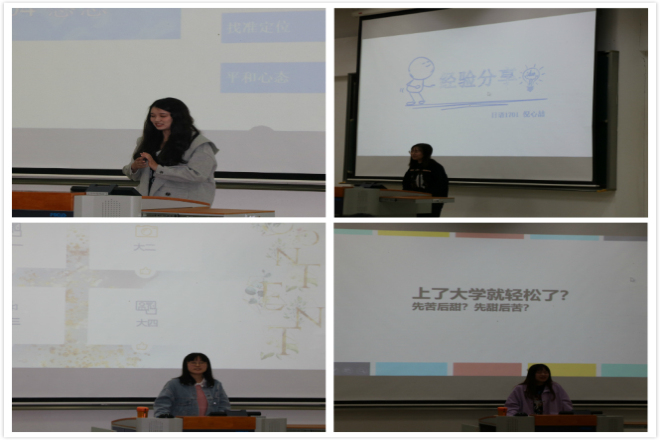 国奖获得者、保研至厦门大学的宁梓含从科研经历、实践经历、个人感想等方面分享了自己学习经验。 “夯实基础,学以致用”、 “戒骄戒躁,潜心投入”、“脚踏实地,找准定位”是她送给现场学弟学妹的关键词。国奖获得者、保研至江南大学的冯小宸为大家分享了自己的成长经历。她说要明确自己的方向、多去尝试,才能找到最适合自己的学习步调。课后充分利用碎片化时间,多和同学老师对话练习、纠正语音语调、加强日语听力练习。