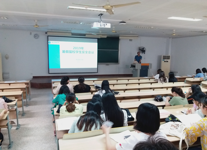 首先,刘伯贤老师强调了假期安全的重要性,明确了学校对暑假留校生的安全管理办法。根据学校对暑假留校生的安排,同时结合外语学院留校生的具体情况,刘老师指出:留校期间的人身安全是第一位的,大家要按照学校、学院的相关要求安排暑假学习生活,在饮食、出行等方面要格外注意。就暑假网络信息安全问题,刘老师结合当前新闻热点事件给同学们进行介绍,并通过身边的真实事件提高大家防诈骗意识以及应对措施。