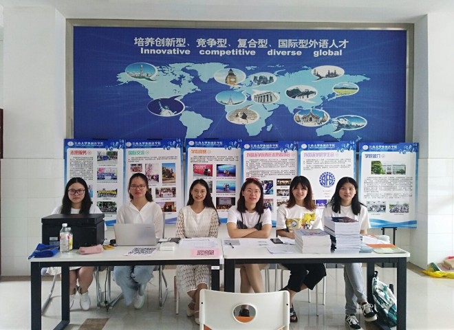 2019年9月5日7点,久雨初霁的早晨洋溢着喜迎新同学的氛围。乐鱼leyu(中国)大楼一楼早已布置一新,刘伯贤副书记、朱义华副院长和分团委书记杨艳老师与外院研会的同学们早已在此等候,准备迎接2019级研究新生的到来。