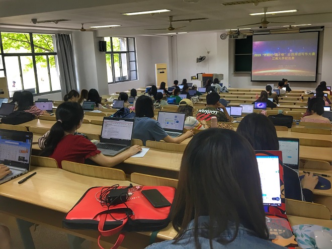 由乐鱼官方端网站登录入口负责举办的2019“外研社·国才杯”全国英语写作大赛江南大学校选赛于2019年9月21日在2D108举行,来自全校各学院的59位学子参加了本次选拔赛。本次校选赛由英语系主任孙志祥教授带领的写译团队负责出题、赛程安排及评阅事宜,郑赛芬博士负责了赛事的具体实施工作。校选赛题型为一篇500词左右的议论文写作及一篇300-500词的应用文写作,答题形式为在线写作,写作时间共120分钟。比赛当天,参赛学生态度严谨、认真写作。