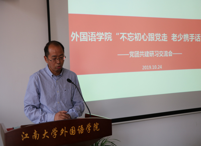 会议伊始,刘伯贤副书记代表学院党委致辞。刘书记说:两支部老党员退休不退岗,在党团共建过程中继续发挥党员余热,点燃青年学子爱国热情,学院党委对共建支部的老党员表示衷心感谢。“本次活动不仅是学院关工委内涵提升的需要,也是为了积极响应习近平总书记在“不忘初心、牢记使命”工作会议上提出守初心,担使命,找差距,抓落实的总体要求。” 最后,刘书记强调:只有理论清醒才有政治坚定,青年学子要将个人思想统一到国家主旋律上。