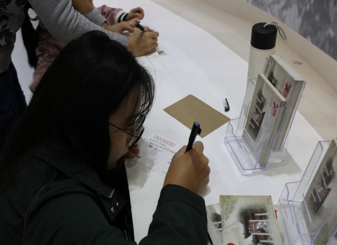 学生在成就展现场书写祝福祖国卡片