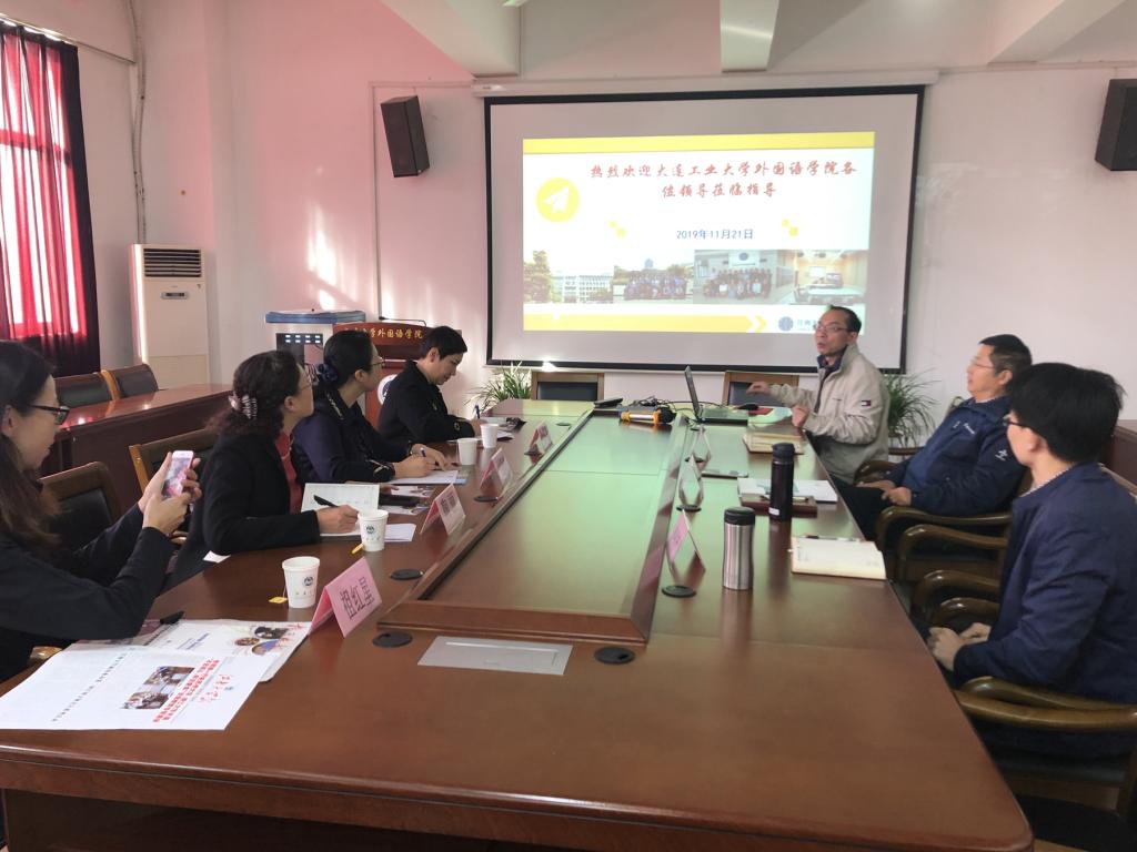 2019年11月21日上午, 大连工业大学乐鱼leyu(中国)一行四人在刘爱君院长的带领下来我院调研专业培养方案修订、专业培养方案论证、专业外语教学等工作,我院方文开院长、朱义华副院长、英语系主任孙志祥教授出席了本次调研交流会。