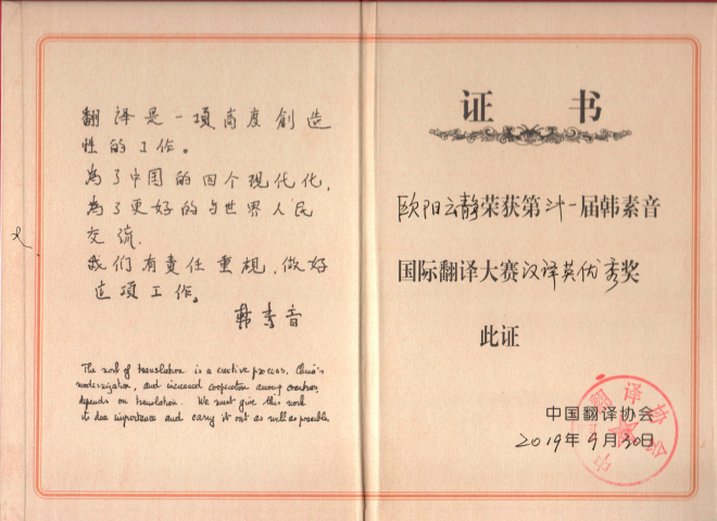 欧阳云静获奖证书