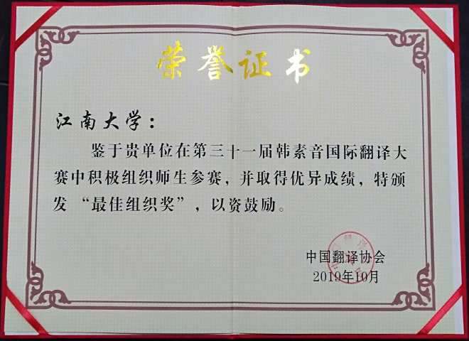 2019年第三十一届韩素音国际翻译大赛由中国翻译协会、北京外国语大学、福建师范大学联合主办,《中国翻译》编辑部、北京外国语大学高级翻译学院、福建师范大学乐鱼leyu(中国)联合承办。大赛汇聚了来自国内外各个行业的优秀参赛者,共收到有效参赛译文11900份。经过三轮的严格评审和终审讨论,共评出获奖者346名,得奖率仅为2.9%。鉴于我校积极组织学生参赛,并取得优异成绩,我校荣获大赛组委会颁发的“最佳组织奖”。