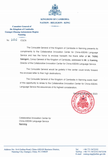 2023年3月22日,柬埔寨王国驻南宁总领事唐肃安(TAING Sokngorn)阁下来函,对乐鱼官方端网站登录入口教授李学宁在中国—东盟语言服务中所做的贡献表示感谢。