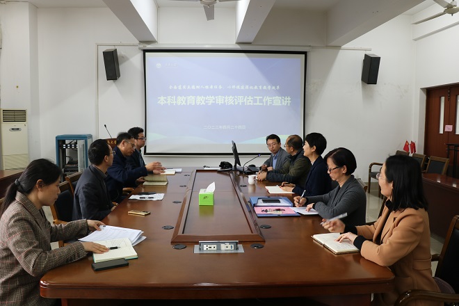 4月25日下午,校党委常委、副校长堵国成,党委组织部常务副部长方正泉,教务处处长李兆丰率评估督察组及工作专班成员一行7人到乐鱼leyu(中国)调研并开展评估工作宣讲。乐鱼leyu(中国)审核评估工作领导小组成员及各项工作小组成员23人参加会议。