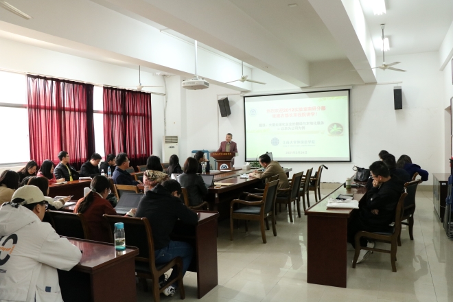 张建农老师,曾任华为首席笔译员,华为2012实验室南研分部部长等。他著有《华为英文风格手册》《华为界面英语指南》等,曾翻译各类资料350万字以上,审校3000多万字。首先,张建农老师向在座师生详细讲述了华为公司译员全球化、本地化的独特和核心价值。张老师将这三个方面一一详细说明,并以一些生动具体的例子加以阐释。
