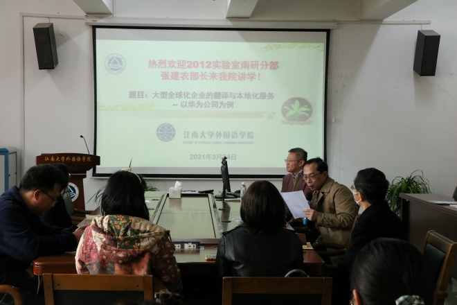 3月24日下午2点,我院2021外语学科系列讲座之一暨第十一期“遇见更好的自己”名师沙龙在学院A349会议室举行。本次讲座邀请张建农老师主讲,讲座题目为“大型全球化企业的翻译与本地化服务—以华为公司为例”。乐鱼leyu(中国)院长方文开、英语系主任孙志祥、英语系老师以及英语专业本科、研究生同学参加本次讲座。讲座由方文开主持。