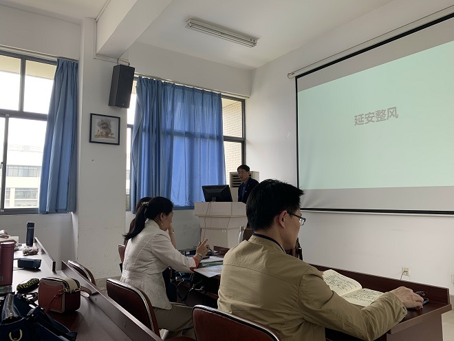 张效国老师首先给全体教师上了一堂生动的党史教育微党课,内容围绕延安整风展开,介绍了延安整风的背景、主要内容、方针方法、延安整风的经验与意义,最后回归到延安整风对加强党的作风建设的现实意义。全体教师深刻认识到延安整风的历史贡献,领悟了加强党史学习对师德师风建设的重要启示。