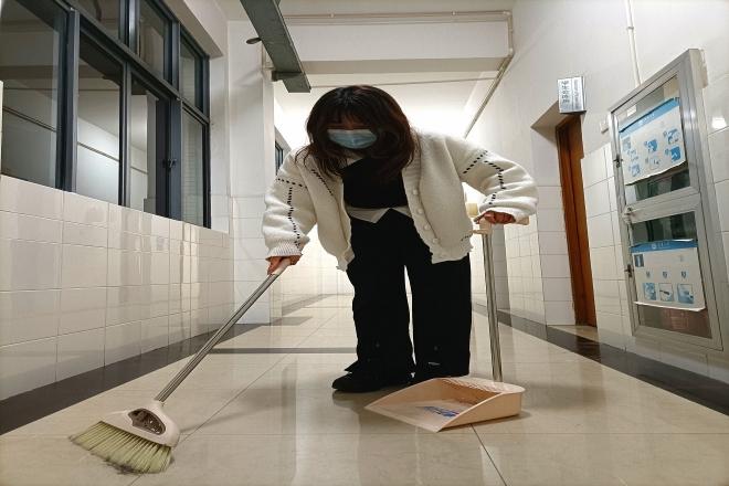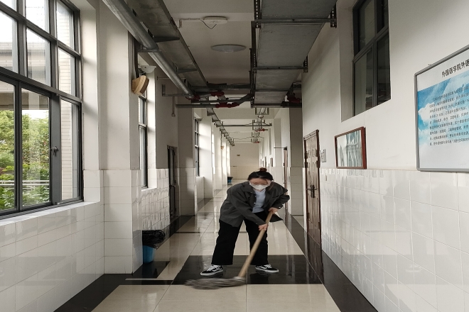“会议上我们仔细讨论了清洁过程中可能遇到的细节问题,尤其是柳絮这一老大难问题。最后我们决定采取两位同学一前一后的原则:一位同学先用拖把润湿、一位同学后用扫把清洁,这样既方便操作,又保证了清扫的质量。”张龙飞同学在会后如是回忆说。