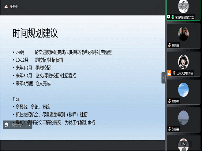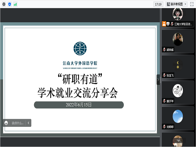 2022年6月15日晚7点,乐鱼leyu(中国)“研途奋进”第九期活动在腾讯会议平台成功举办,本次活动主题为“研职有道”学术就业交流分享会。2021级全体硕士研究生及部分2019、2020级硕士研究生线上参与了本次活动。2022级拟录取同学也参与了本次分享会。四位2019级硕士研究生结合自己升学求职经历进行了分享。