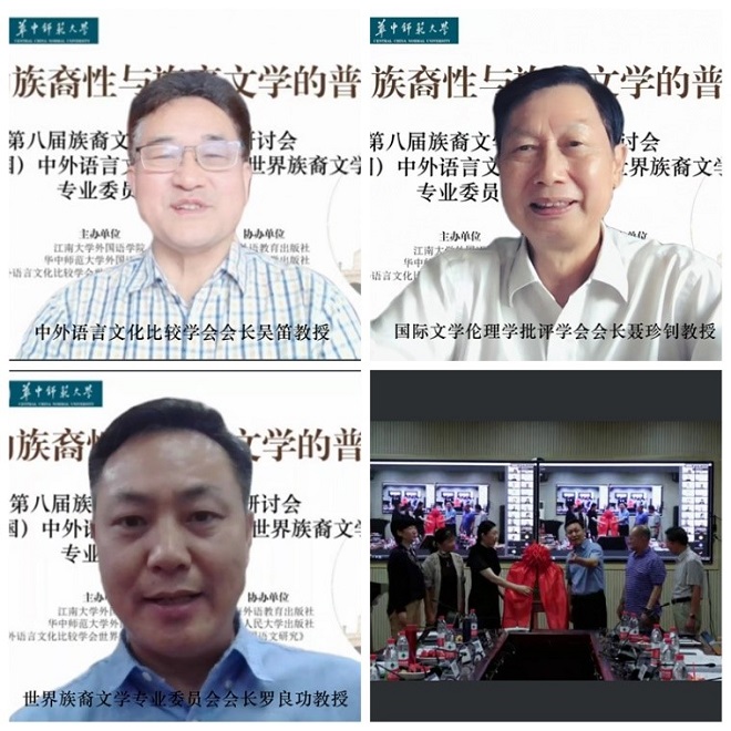 2022年7月16-17日,由乐鱼官方端网站登录入口、华中师范大学乐鱼leyu(中国)和中外语言文化比较学会世界族裔文学专业委员会联合主办的“文学的族裔性与族裔文学的普遍性:第八届族裔文学国际学术研讨会暨(中国)中外语言文化比较学会世界族裔文学专业委员会成立大会”成功召开。会议由上海外语教育出版社、中国人民大学出版社、《外国语文研究》编辑部协办。来自美国加州大学洛杉矶分校、美国马萨诸塞大学、美国宾州州立大学、美国加州州立大学洛杉矶分校、日本大学、马来亚大学、韩国东国大学、北京大学、浙江大学、复旦大学、南京大学、中国人民大学、四川大学、北京师范大学、广东外语外贸大学、东北师范大学、华中师范大学、暨南大学、杭州师范大学、上海师范大学、南京师范大学、湖南师范大学、山东师范大学、杭州电子科技大学、江南大学等国内外百余所高校的300多名专家学者参与会议。由于疫情的持续影响,本次会议采用线上线下相结合的方式。