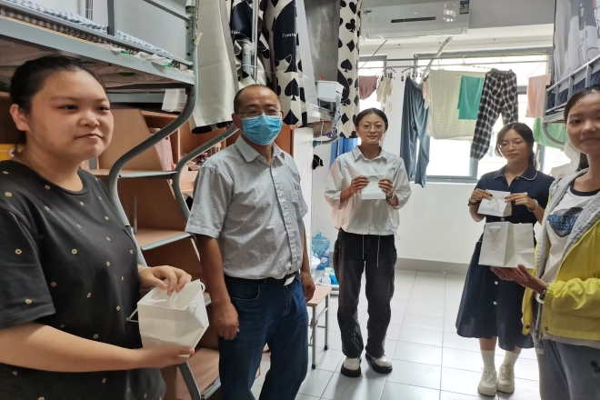 学院领导老师在走访宿舍过程中与新生交谈,详细地询问了新生的家庭情况和入学感受,以及对新学校新环境的适应情况。新生们还就自己关心的问题与老师们进行了交流,学院党委副书记刘伯贤表示希望同学们尽快适应大学生活,制定目标,做好规划,合理的安排个人时间,按照学校疫情防控要求,做好个人健康日报,及时参加校园核酸检测,并叮嘱新生有困难可以向班主任和辅导员反应,共同解决。临近中秋佳节,学院准备了中秋节月饼,由班主任老师在走访宿舍过程中送给22级新生,让大家感受到学院的温暖。